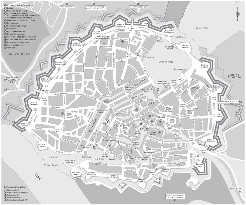 „Da lag sie vor mir – meine künftige Vaterstadt – in ihrer ganzen venezianischen Pracht. Mir wurde eng, u. bang. Je näher wir seegelten, desto höher schwellten bange Ahndungen mein Herz. welch ein Anblick, – als wir die zahllosen Schiffreihen vorbeyfuhren, das Gewimmel dieser kosmopolitischen Wasserstadt ansahen – die verschiednen Sprachen hörten – es ist mir in Prosa unbeschreiblich. Am Blockhause wurden wir examinirt. Wir fuhren durch den Hafen. Legen an beym Baumhause. ich springe ans Land – Republikanischer Boden!“